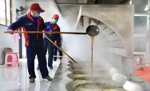 义乌市义亭镇的蓑衣人红糖厂,今年“双十一”把直播镜头对准了传统熬糖车间——八口“排锅”依次排开,糖汁经熬煮、浓缩、冷却凝结成红糖,蔗糖香气透过屏幕传递给网友。