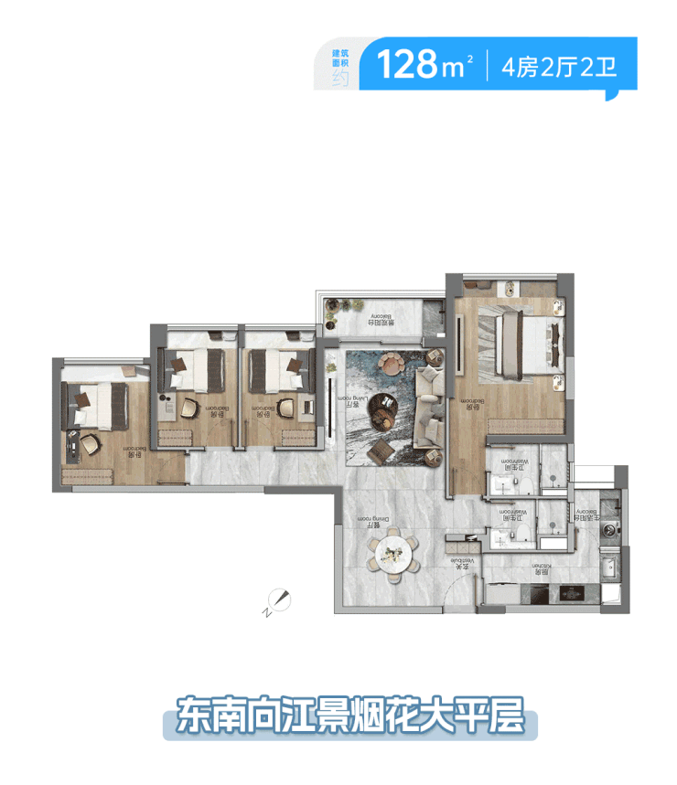 而约128㎡的大平层,更将“好用”升华为日常的诗意。五开间瞰江与超过16米的观景面,品质生活感拉满。一家人从晨起的用餐、午后的阅读,到孩子的嬉戏,总能被温润的阳光与开阔的江景所环绕。