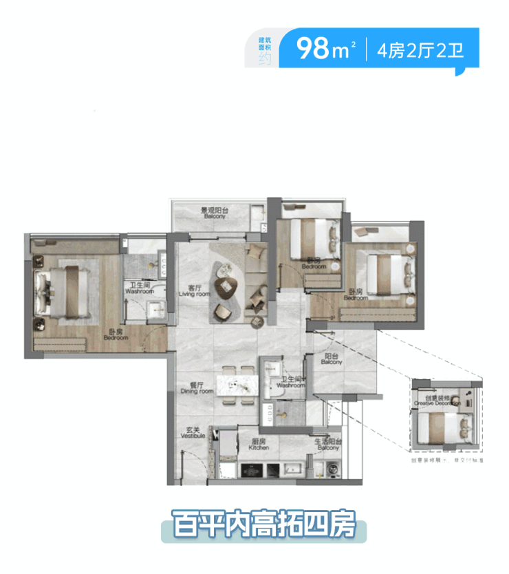 其户型也极具成长性。如建面约98㎡的一步到位四房,是区域内罕见的百平米内的四房产品,“0过道”设计将每一寸面积都归还给功能,还预留一个创意空间,按需规划为卧室、书房等,让房子随家庭一同成长,免去频繁换房的烦扰。