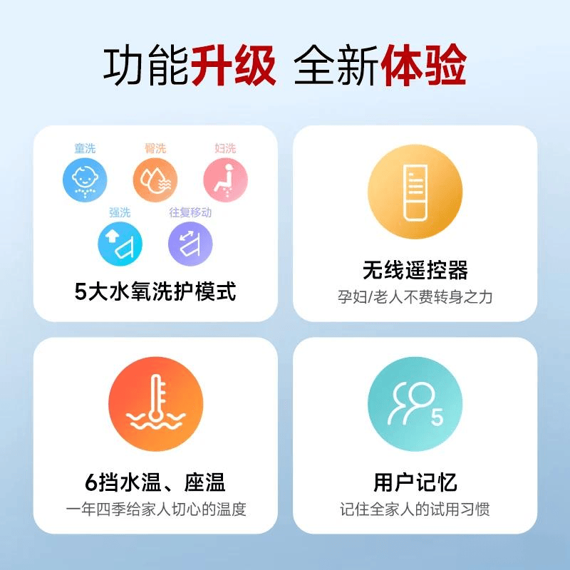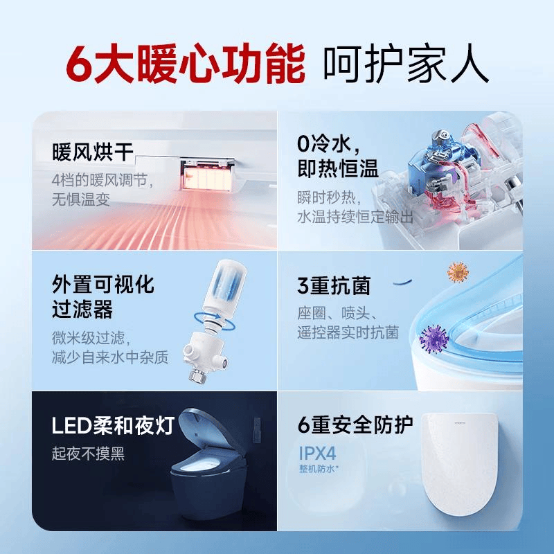 选购建议:如果你想要一个功能强大、使用起来更便捷的智能马桶盖,智米这款绝对值得入手。它有SIAA认证的抗菌材质,抗菌率达到99.99%,而且有五挡水温调节和四挡风温调节,四季都能享受舒适的体验。而且,它的即热式加热和水氧技术,真的是用了就知道有多好。别看它功能多,价格也超级合理,真的值得你为家人投资。